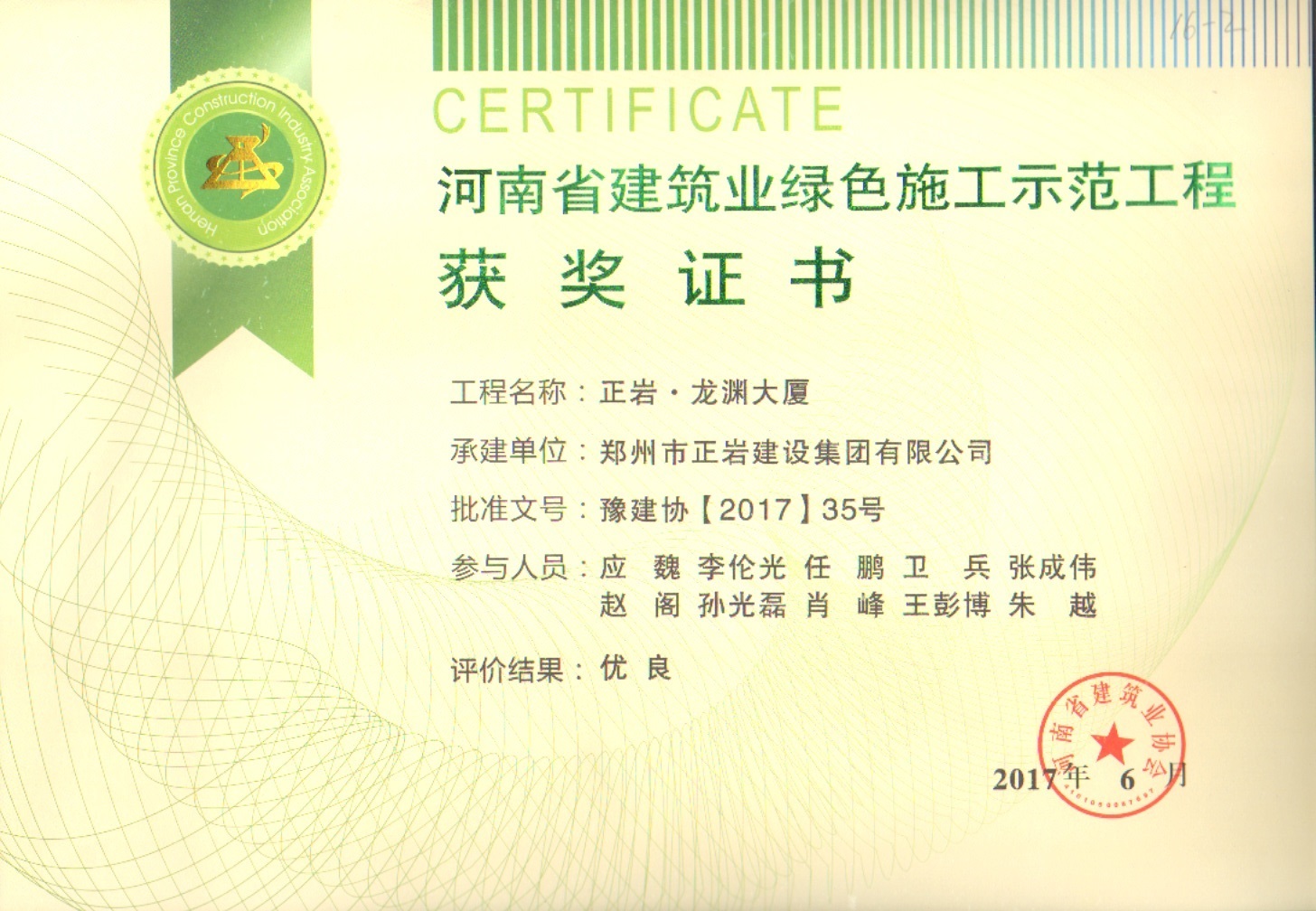 2017河南省建筑業(yè)綠色施工示范工程獲獎(jiǎng)證書(shū)