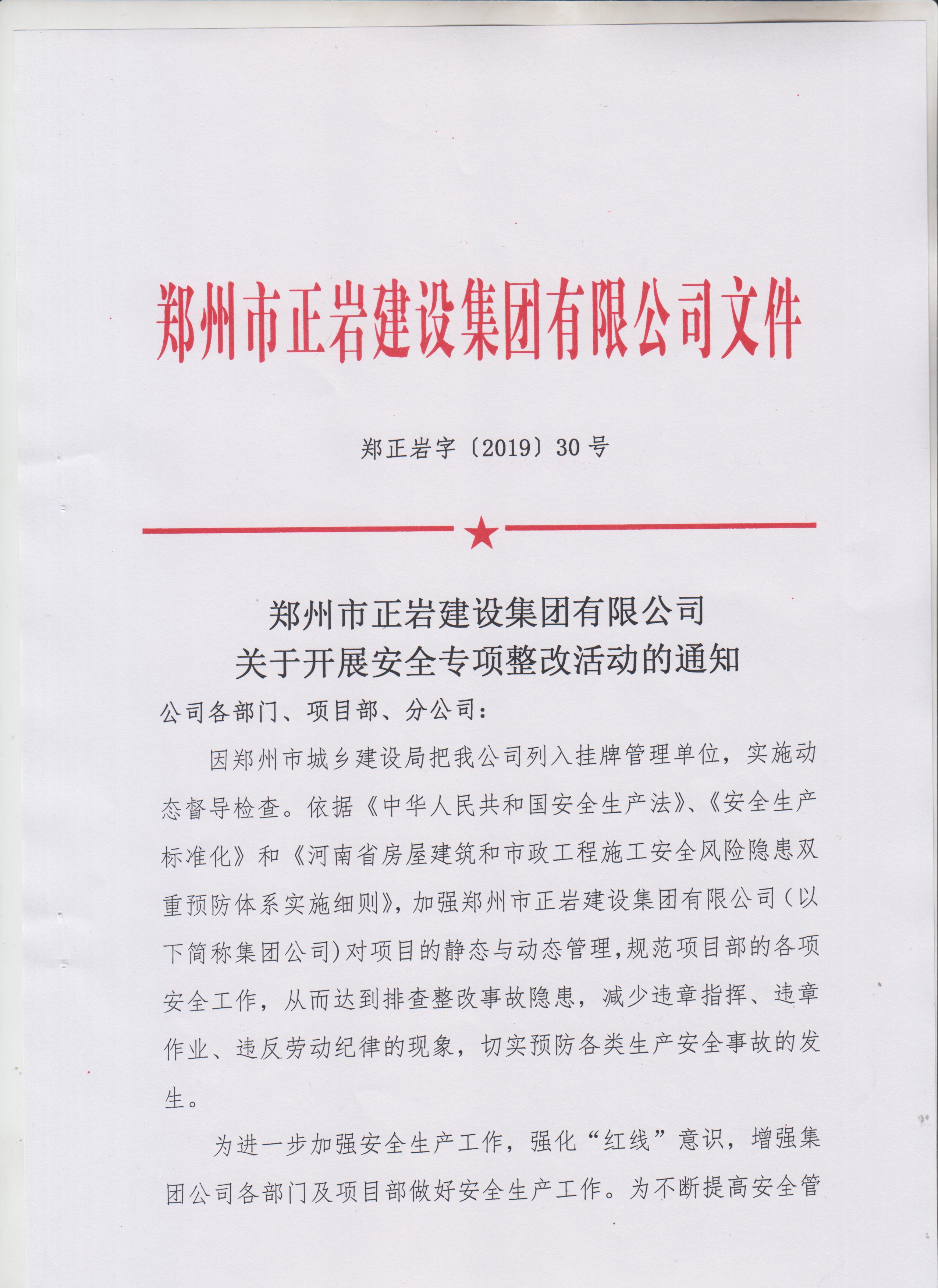 鄭州市正巖建設(shè)集團(tuán)有限公司關(guān)于開(kāi)展安全專項(xiàng)整改活動(dòng)的通知