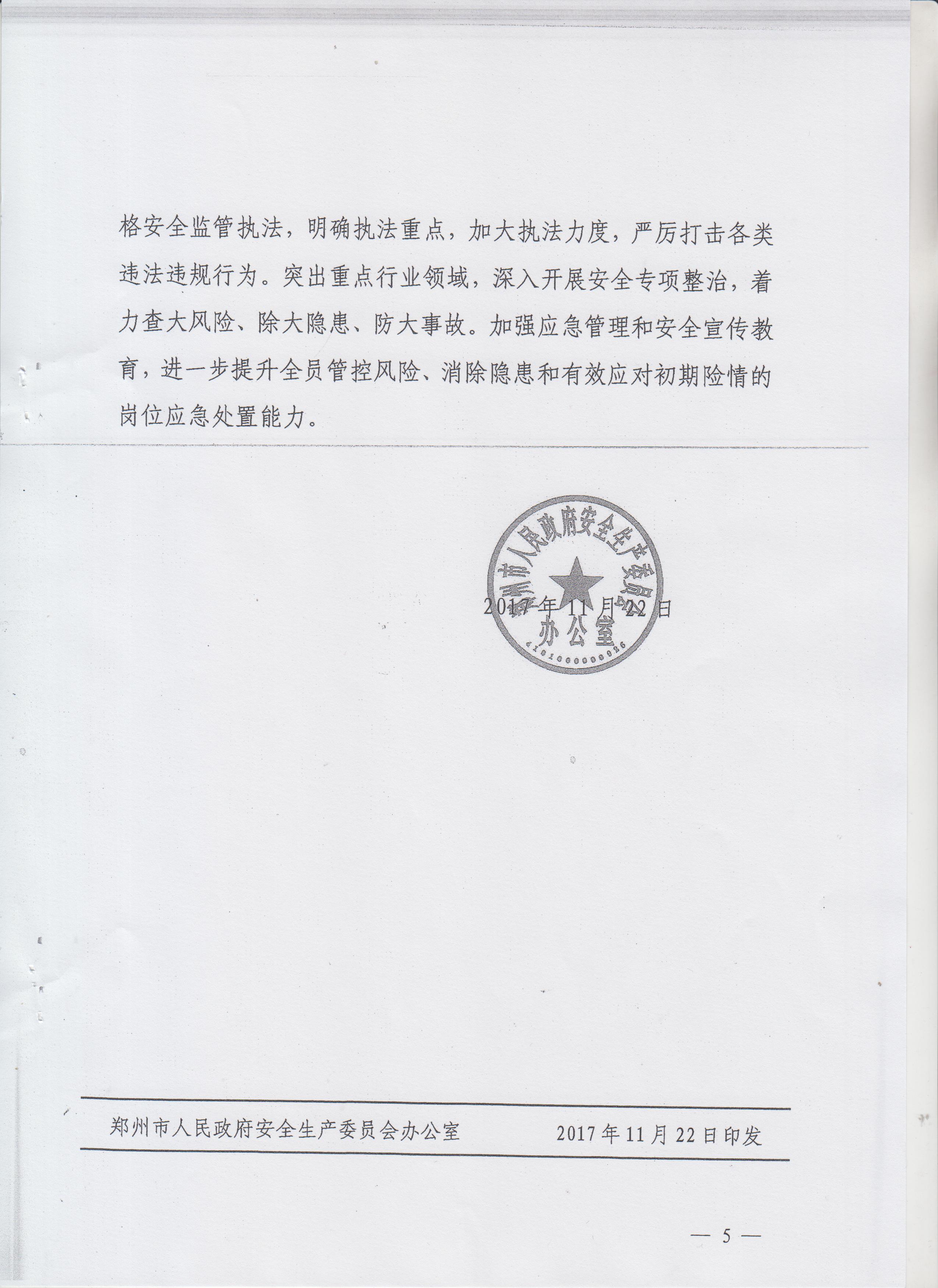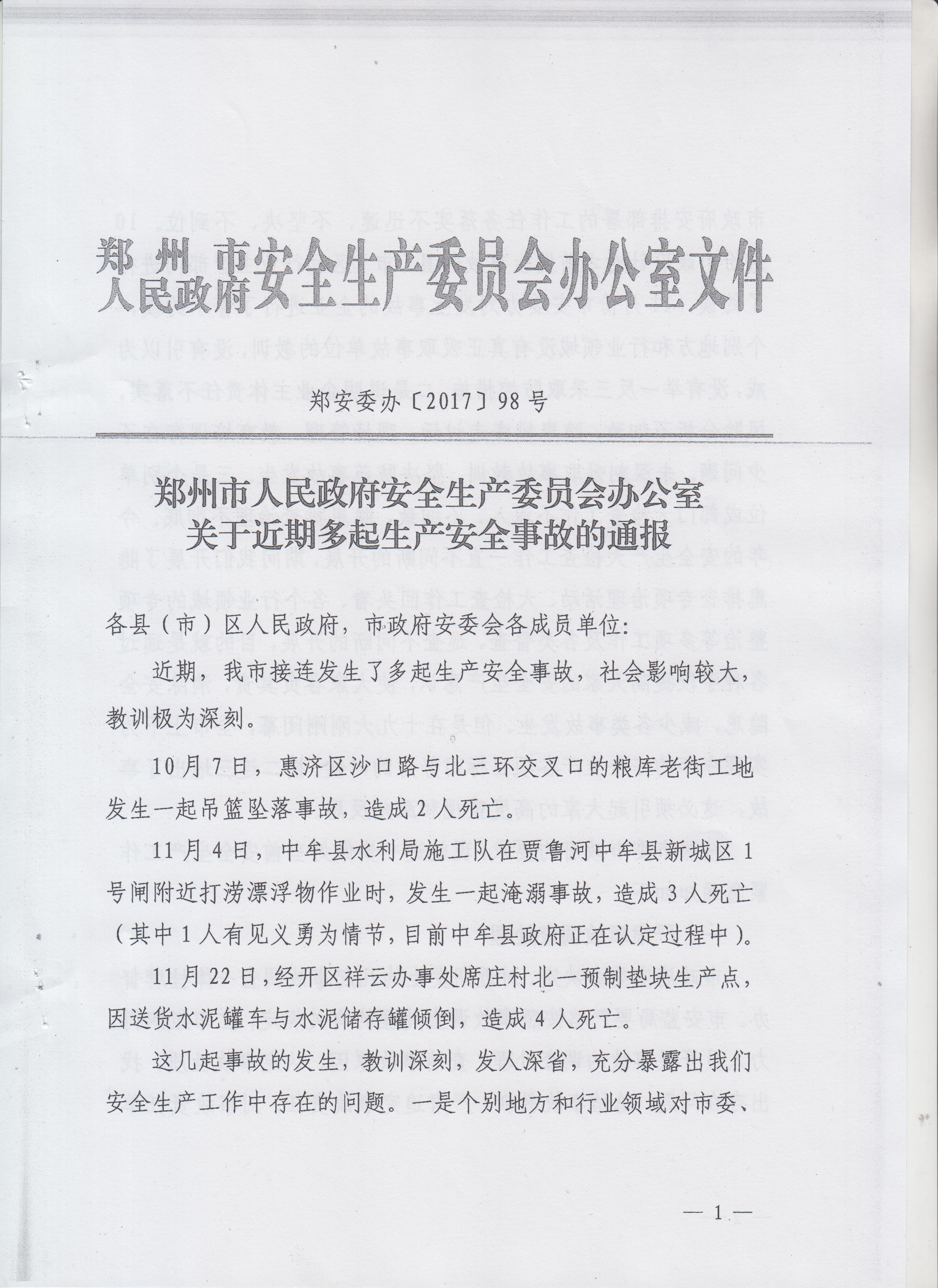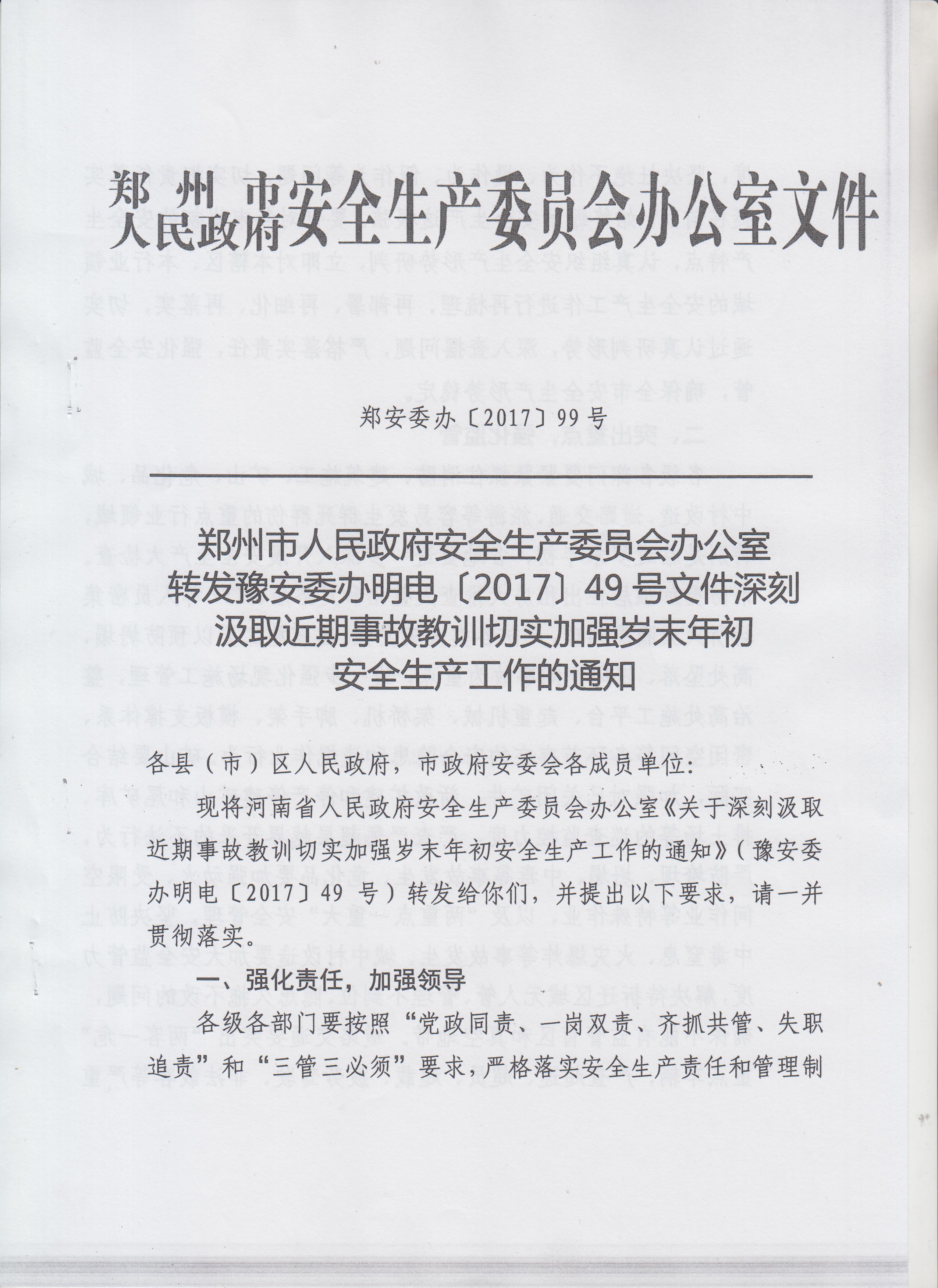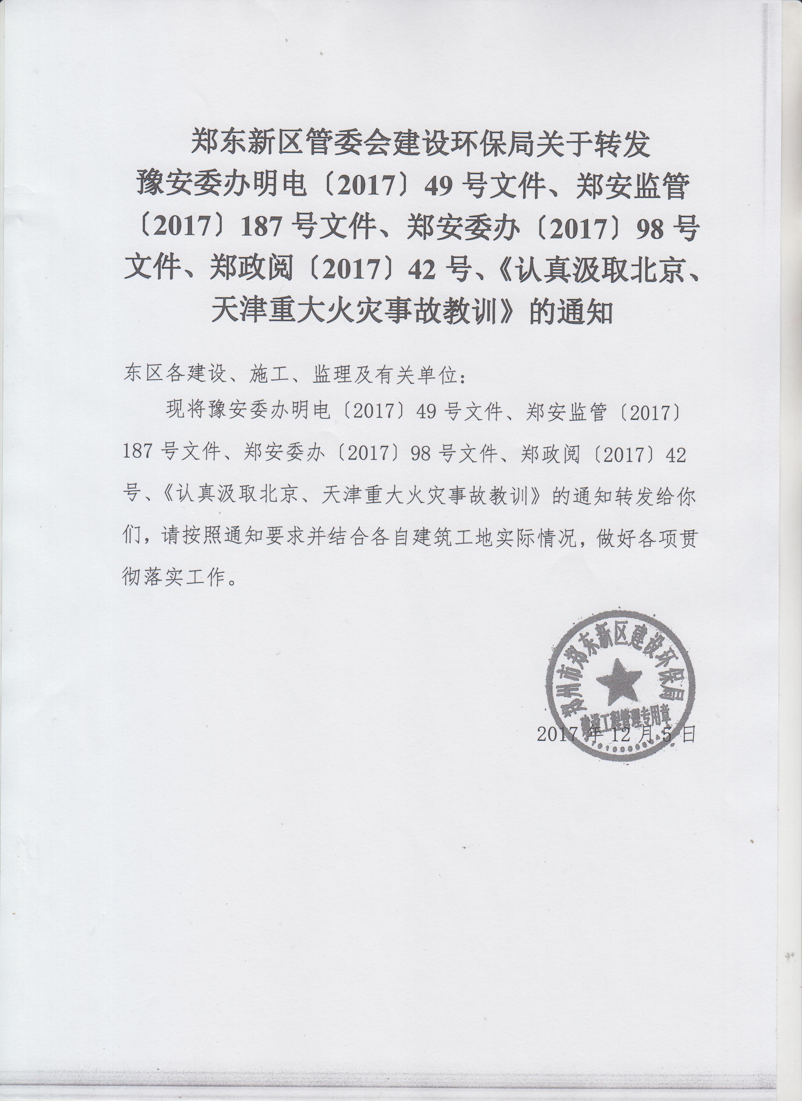 關(guān)于轉(zhuǎn)發(fā)豫安委辦明電【2017】49號(hào)文件、鄭安監(jiān)管【2017】187號(hào)文件、鄭安委辦【2017】98號(hào)文件、鄭政閱【2017】42號(hào)、《認(rèn)真汲取北京、天津重大火災(zāi)事故教訓(xùn)》的通知