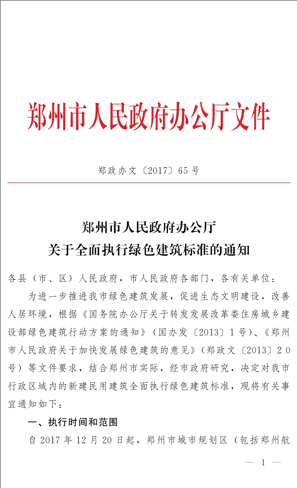 鄭州市人民政府辦公廳關(guān)于全面執(zhí)行綠色建筑標(biāo)準(zhǔn)的通知
