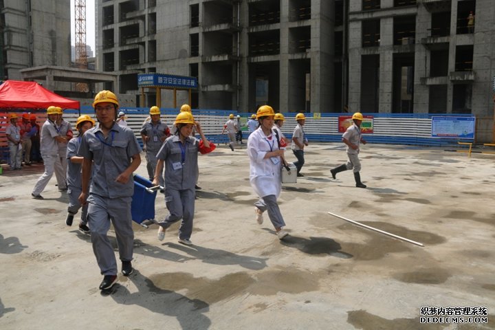 應(yīng)急救援演練中救援人員奔向高空墜落事故現(xiàn)場