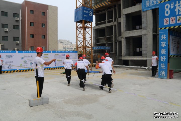 應(yīng)急救援演練中救援人員用擔(dān)架救援被砸傷的“人員”